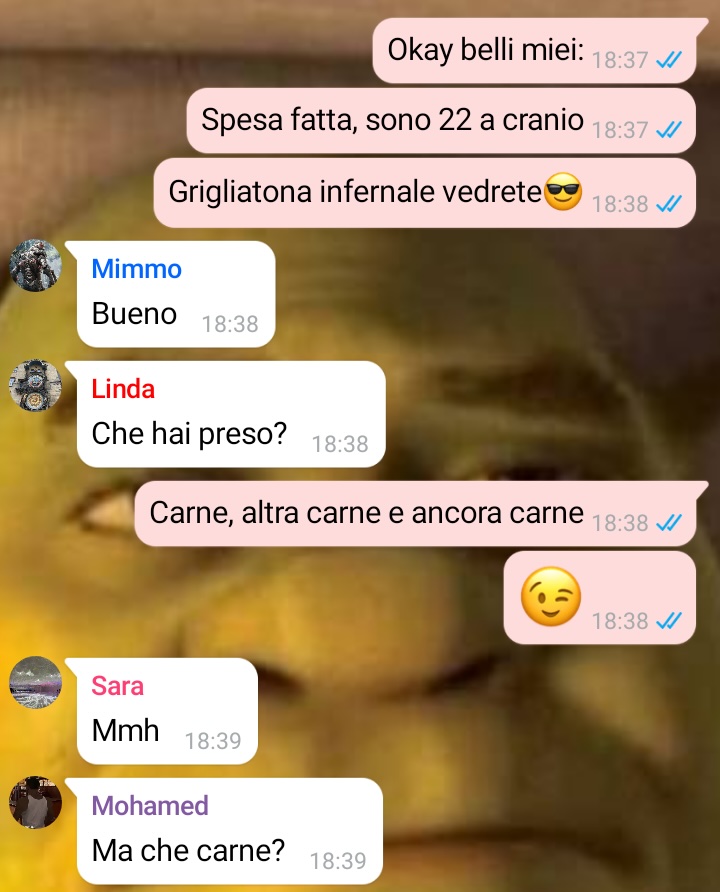 “Ciao a tutti, vi mando da esasperato una breve storia triste: da mega Pasquetta con amici a un ritorno old school. Mi chiamo Valentino e amo, ma proprio con tutto il cuore, tutto ciò che si può fare all’aperto: sport, campeggio, trekking ma soprattutto…grigliate. I vegetariani non me ne vogliano, ma è veramente qualcosa a cui non so rinunciare. Un’altra cosa che amo fare è più o meno coinvolgere i miei amici in attività di questo genere, naturalmente nei limiti. Ogni anno, però, come da tradizione, si organizza una grigliata tutti insieme per Pasquetta. Questa volta, quando abbiamo deciso il posto e quanti essere,  mi è stato fatto notare che normalmente sono sempre io a decidere per tutti e così ho lasciato il comando “al popolo”. Il motivo per cui però sono io che di solito prendo in mano la situazione, è che gli altri sono terribilmente confusionari…e infatti questo esperimento democratico è finito in pochissimo tempo, con tanto di “epurazioni” immediate dal gruppo. Non faccio mai discriminazioni nella vita: ho amici di ogni religione, paese e idee politiche…ma raga, chiunque si metta sulla strada di un ventunenne giocatore di rugby da 100 chili e passa e la sua amata grigliata, è destinato a perdere. Non mi faccio problemi a grigliare anche i polemizzatori di professione.”