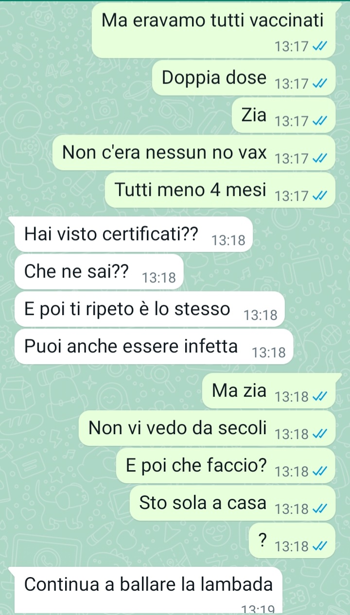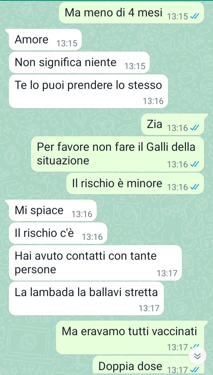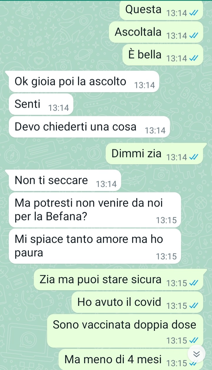 “Cosa ne pensate delle persone che ti escludono perché hai avuto contatti sociali con altri?? Io mi sento molto amareggiata. Abito a Milano da alcuni anni e scendo a casa al sud solo per le feste. Negli ultimi anni sono scesa meno, a volte bloccata dai lockdown e una volta perché avevo io il Covid che per fortuna mi è venuto in forma leggera.