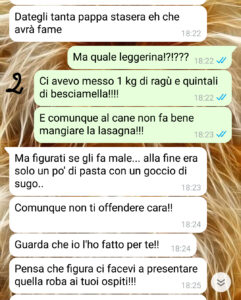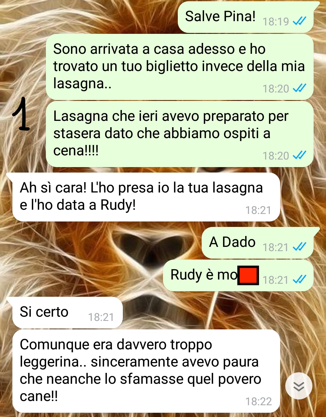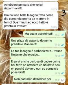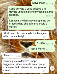 “Bene: oggi Vittoria è tornata a casa e ha scoperto che sua suocera Pina, complice il possesso delle chiavi di casa, si è introdotta a casa di Vittoria e del marito Ferruccio e ha spadroneggiato come sempre! Questa volta Pina non ha saccheggiato l’armadio di Ferruccio ma, almeno secondo Vittoria, ha fatto molto di peggio: ha rapito la succulenta lasagna che Vittoria aveva preparato la sera prima per offrirla ai suoi ospiti nella cena di stasera! Così la lasagna di Vittoria è scomparsa.. o meglio è diventata la cena di qualcun altro.. e nel forno è comparso un mattone carbonizzato che l’intrepida suocera Pina si ostina a chiamare “lasagna”! Ma perché la lasagna realizzata da Pina puzza in un modo orrendo?! E perché Pina ha ritenuto necessario sostituire la lasagna di Vittoria con una fatta da lei?!?! La ormai furibonda Vittoria non vuole aspettare a sentire la versione di Pina riportata da Ferruccio e così scrive direttamente a Pina per capire cosa sia successo e soprattutto perché…”