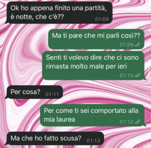 Per la discussione di laurea e per la festa ovviamente ho invitato le persone a me più care: la mia famiglia, le mie amiche e il mio fidanzato. Ecco, lui è stato il fulcro del problema. Ha avuto un’aria strana tutto il giorno, per cui il giorno dopo gli ho scritto chiedendo spiegazioni e quello che mi ha confessato mi ha lasciata senza parole… Ma secondo voi è normale che un fidanzato reagisca in questo modo? Mi sono sentita veramente sminuita. Come posso gestire la cosa adesso??