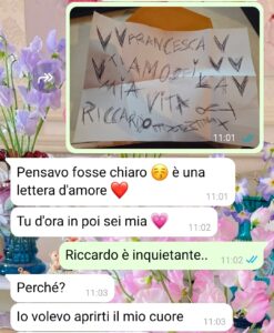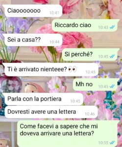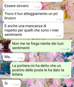 “Ciao, voglio spendere qualche parola per ringraziare Spunteblu per aver accettato di pubblicare queste mie righe e gli screen della mia storia, perché è importante che si sappia che esistono persone del genere e che, probabilmente, queste non si rendono conto di essere così, di avere un problema serio. Io stessa mi pento amaramente e ci tendo a specificarlo, per come mi sono comportata nei confronti della persona con cui chattavo. Perché sarei potuta essere più comprensiva e meno cattiva, ma capirete bene che mi sono un attimino alterata e anche un po’ spaventata. Fatto sta che io mi chiamo Francesca, che ho 28 anni e mi ritengo una ragazza abbastanza normale, una che sicuramente piace ma non mi ritengo chissà che bellezza, anzi. Ho conosciuto un ragazzo che si chiama Riccardo e con il quale ho chattato per un poco e l’ho incontrato una sola volta in piazza, una chiacchierata e poi la cosa tra noi è continuata. Il giorno dopo il mio incontro con lui mi viene recapitata una lettera e aprendola non potevo non contattarlo immediatamente.”