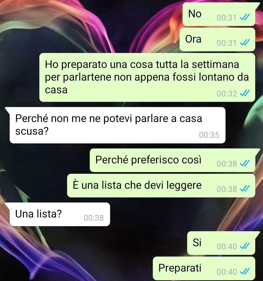 “Ciao Spunte Blu. Il mio ragazzo mi ha deluso, veramente deluso, tanto. Il suo comportamento mi ha fatto veramente stare male. Io e lui conviviamo e qualche giorno fa lui è tornato a casa dei suoi per le vacanze di Natale, e una volta arrivato a casa ho deciso di scrivergli per discutere di una cosa.