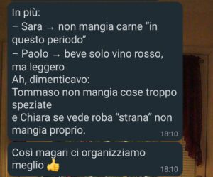 Un elenco di istruzioni, come se io fossi un servizio catering. Come se il mio tempo, il mio corpo, la mia fatica fossero una cosa neutra, invisibile.