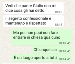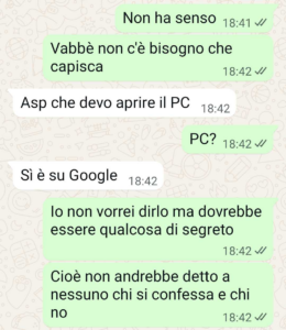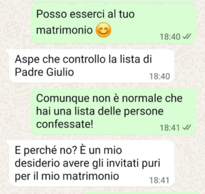 ma lei vuole trasformare le sue nozze in un modo per evangelizzare. Vuole che ci confessiamo tutti con padre giulio, il parroco della nostra chiesa, infrangendo non quante regole di segretezza. Boh, non so come sia possibile. Ma intanto ha fatto sta lista di chi si confessa. E io? Io ci sono …”