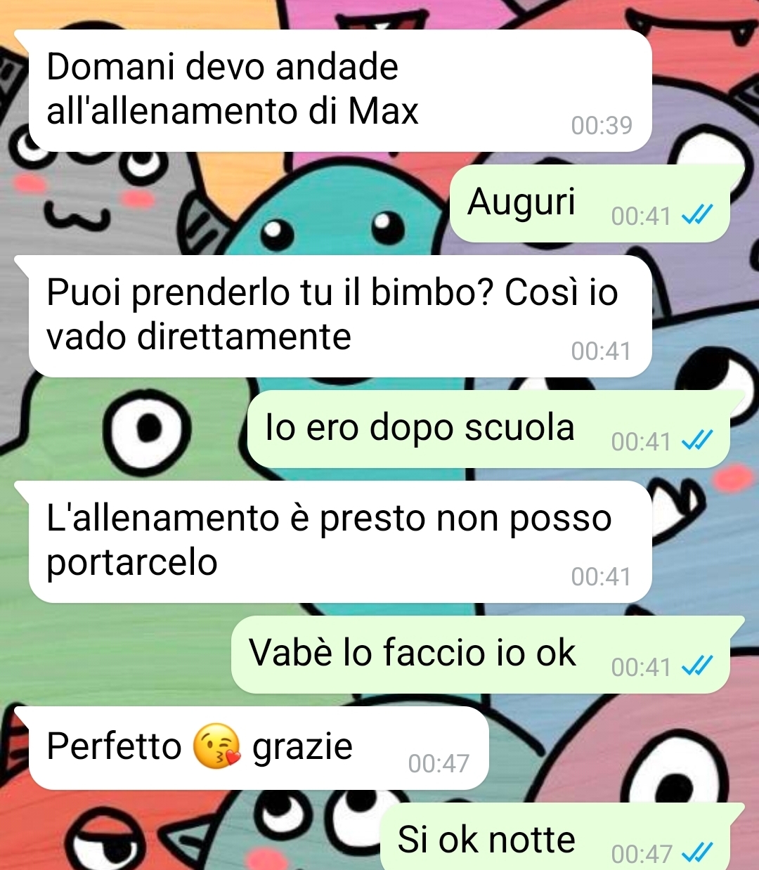 Perché riguarda la mia famiglia che va in pezzo dopo che ho avuto dei problemi di salute, che mia moglie ha chiaramente avuto dei problemi mentali legati a ciò che è successo e ci ha portati a lasciarci. Ormai saranno sei mesi che io e lei siamo separati e si è già trovata un’altra persona. Ma nonostante mi rode un po’ sapere che già si è rifatta una vita e sia così contenta di sbandierare questa cosa a destra e a sinistra, quello che mi preoccupa maggiormente è mio figlio. Lui ha solo 7 anni e anche se non gli abbiamo detto della separazione, non è uno che non capisce, anzi. Siamo pure stati da un avvocato che ci ha detto di comportarci civilmente o si dovrà passare da un giudice, ma mi sa che la strada sarà quella. Una mattina lei doveva incontrarsi con la sua nuova fiamma e ha ben pensato di lasciarmi il piccolo per tutto il giorno, cosa che comunque a me fa piacere. Peccato che io abbia scoperto che lei lo tratta in un modo che mi verrebbe da dire essere alquanto squilibrato.”