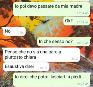 “Di recente ho avuto una brutta discussione con il mio ragazzo, con il quale convivo ormai da un anno. Stiamo insieme da più tempo chiaramente, ma la convivenza dura da più o meno poco. Ora, il problema principale risiede nel fatto che il mio ragazzo crede che io sia troppo apprensiva con mia madre, ma vi chiedo di rendervi conto che è vedova, vive con un’infermiera a casa sua, non sta in strutture o altro e mi rendo conto che il momento di dirle addio si sta avvicinando. So anche che da quando stiamo insieme la sua presenza è sempre stata costante nella nostra relazione, ma solo perché mi sembra piuttosto normale che i figli debbano prendersi cura dei propri genitori, mi sembra il minimo. Non è che me la sono portata in casa quando mi sono trasferita, ma una volta tanto dovrei andarci, soprattutto se non sta proprio benissimo. Nulla, questa cosa ha fatto partire una discussione accesa che ha portato a una litigata tremenda, dovuta a un suo atteggiamento per me tossico a dir poco.”