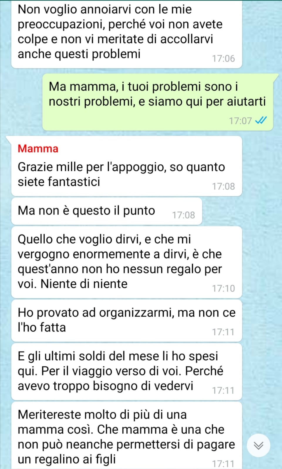 “Buongiorno a tutti e buon Natale, se questa chat verrà letta prima delle feste. Ho voluto condividere questa conversazione per farvi capire quanto la magia del Natale possa essere forte. Ed anche per mostrarvi quanto la mia mamma sia unica e meravigliosa. Lei è vedova da alcuni anni, ha perso il lavoro da pochi mesi, ed è profondamente in difficoltà soprattutto economica.