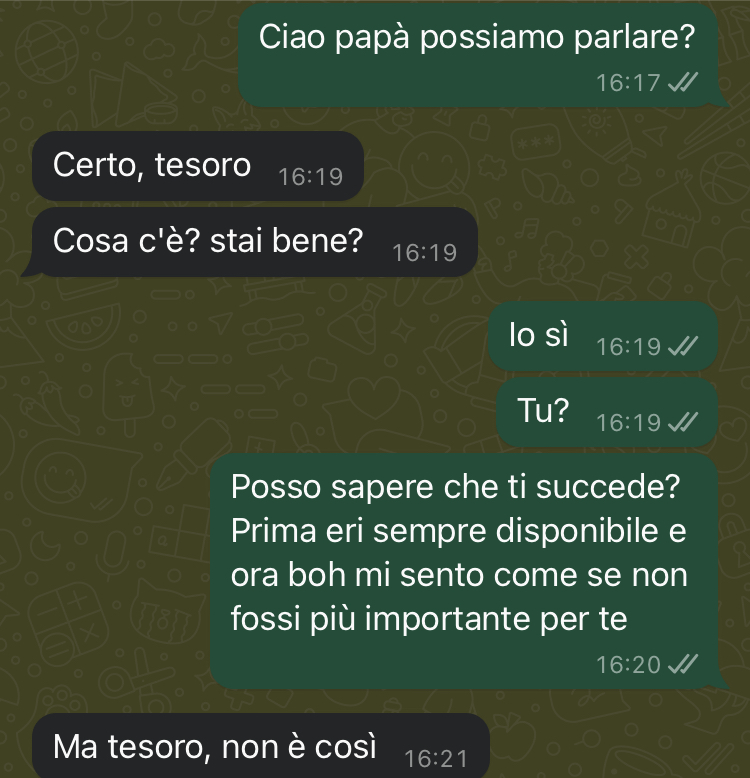 “Ciao spunteblu, sono ancora io. Dopo aver visto quelle chat tra il mio adorato padre e sua nuova moglie Dorina, sono stata molto male. Ma ho deciso di affrontarlo subito perché non potevo tenermi quel dolore dentro. Ovviamente ho fatto finta di niente, cioè ho fatto finta di non aver mai letto quelle chat e di basarmi solo sulle mie sensazioni, che comunque sono vere e lo erano anche prima di leggere quelle cose.