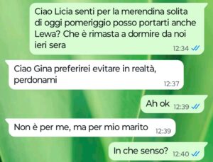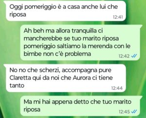 “Buongiorno Spunte Blu sono una mamma single ben felice di esserlo. Io e la mia piccola Claretta ci siamo trasferite da poco tempo in un’altra città e lei ha preso a frequentare la terza elementare. Contro ogni mia preoccupazione e ansia da cambiamento devo dire che Clara si è ambientata benissimo nella sua nuova classe facendosi subito tante amichette. Negli ultimi mesi in particolare ha legato moltissimo con Aurora un’altra bimba della sua classe tanto che ormai ogni mercoledì pomeriggio io e la mamma di Aurora abbiamo appuntamento fisso per fare incontrare le bimbe per una merendina insieme. I nostri appuntamenti di solito avvengono a casa di Aurora così prima ho scritto a questa mamma per farle una piccola richiesta rispetto alla solita merenda del mercoledì. Leggete pure che risposta ho ricevuto da questa donna vergognosa e marcia dentro. È vero che ci conosciamo da poco ma non credevo che lei e suo marito fossero persone così orribili…”