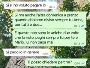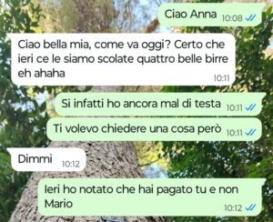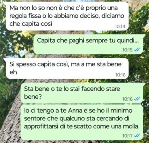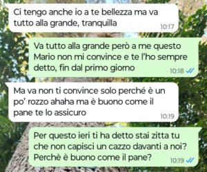“Carissime Spunte Blu oggi voglio condividere con voi una storia veramente triste e squallida che riguarda la mia migliore amica Anna. Io le voglio un bene dell’anima, abbiamo condiviso una vita insieme fin dall’asilo e continuiamo a farlo, per me Anna è la sorella che non ho mai avuto insomma… la mia amica però l’anno scorso si è messa con uno e da pochi mesi ci convive pure. Questo tizio è davvero terribile e personalmente non mi ha mai convinta, fin dal primo giorno e infatti ad Anna io questo l’ho sempre fatto presente anche se lei si ostina a fare orecchie da mercante ogni volta che si parla di lui, ma dopo quello che è successo ieri sera quando siamo usciti tutti insieme, penso proprio che chiuderò i ponti con tutti e due… con lui perché è solo un pezzo di merda che la tratta male e con lei perché continua ad ostinarsi facendo finta di non vedere con che razza di animale è andata a convivere. Secondo voi sbaglio a chiudere i ponti anche con lei? Non mi ascolta e io non ne posso più di vederla ridotta così per colpa di un animale.”