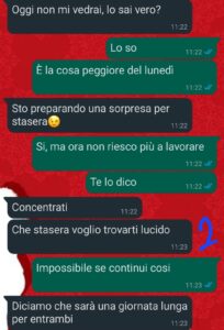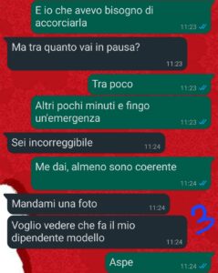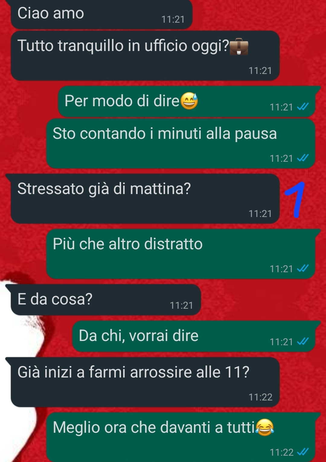 Lei dice che è solo per un po’, che serve tempo, che non vuole rovinare nulla. Io invece ho paura solo di perderla, perché ogni giorno che passa sento di appartenerle un po’ di più, anche se nessuno deve saperlo e questa cosa mi distrugge. Oggi non è venuta in ufficio: dice che mi sta preparando una sorpresa. Io sono qui, in pausa, davanti al pc spento, con la testa piena di lei e una certezza che fa male: posso aspettare ancora, sì, ma non so per quanto.”