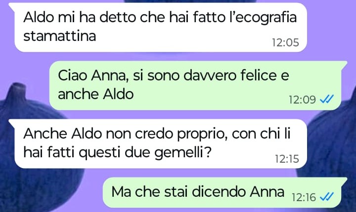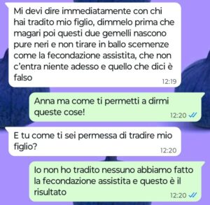 “Ciao Spunte Blu, chi vi scrive è una povera donna abbandonata dal proprio compagno. Io e il mio compagno desideravamo tantissimo avere un bambino ma purtroppo io non riuscivo a restare incinta e così abbiamo optato per la fecondazione assistita e finalmente ce l’abbiamo fatta, sono rimasta incinta. Stamattina vado a fare la mia prima ecografia e non appena ricevo il responso telefono subito al mio compagno per comunicargli cosa stiamo aspettando: due fantastici gemelli! Anche se ancora il sesso non è confermato ma solo supposto visto che si tratta della primissima ecografia. Lui mi risponde felice dalla gioia scusandosi per non aver fatto in tempo ad accompagnarmi dal medico per l’ecografia. Mezz’ora fa però arriva lo shock, ovvero mi contatta la madre del mio compagno e leggete un po’ cosa mi ha scritto. Adesso correrò immediatamente a casa sua perché devo parlare con il mio compagno e questa storia deve finire, questa strega di mia suocera deve smetterla e deve imparare a stare fuori dalle nostre vite perché non può trattare il figlio come se avesse ancora 10 anni!”
