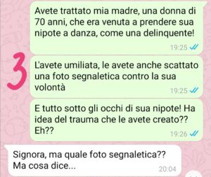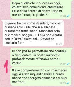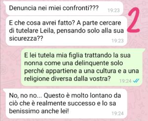 Ma quando mia madre arriva a prendere la bambina…succede un disastro…la maestra si rifiuta di consegnarle Leila nonostante lei continui a dire che è sua nonna. Io sono altamente indignata per quello che è successo e mando gli screen perché voglio denunciare questa storia anche sui social affinché queste cose non accadano più. Il razzismo va combattuto sempre!”