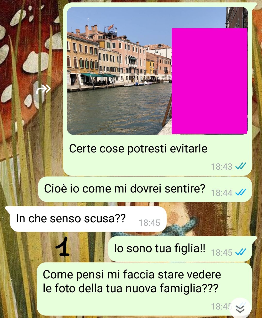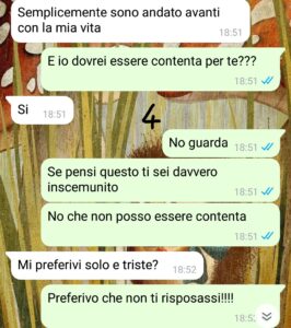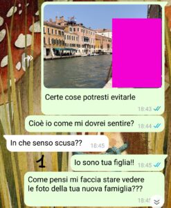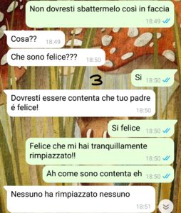 Cioè anche mia mamma ha degli “amici” ma mica ci ha messo su famiglia insieme.. Ieri mio padre ha postato una foto con la sua nuova famiglia e io non ci ho visto più e mi sono lamentata.. quello che mi ha risposto mi ha lasciata senza parole..”