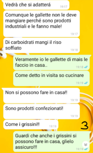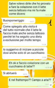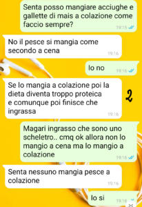 Già alla visita la signorina in questione si è posta molto male: mi ha detto che dovevo fare colazione, che dovevo mangiare il formaggio anche se io sono intollerante da sempre, che dovevo.. Scortesia e saccenza a parte speravo che avrebbe comunque fatto il lavoro per cui era stata pagata: costruirmi un piano alimentare che mi aiutasse a sostenere questo mio periodo di cura.. e magari che mi aiutasse a prendere un po’ di peso dato che sono ormai ridotta a uno scheletro, senza ciccia né muscoli!
