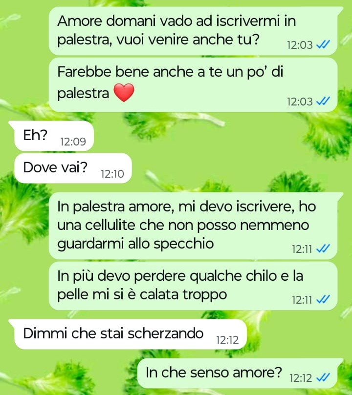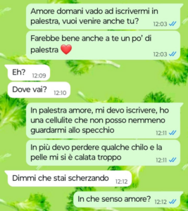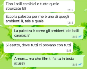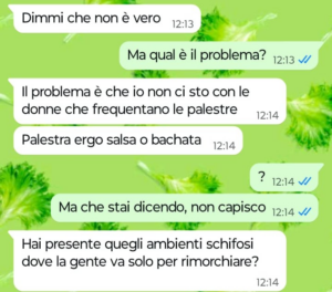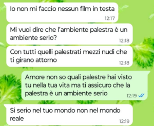 Bene, questo è proprio quello che vorrei fare io se non fosse che il mio ragazzo non la pensa affatto come me. Perchè il mio ragazzo la pensa diversamente? Eh e qui sta il bello. Il mio ragazzo pensa che il mondo palestra sia un mondo a sé e oggi l’ha paragonato ad altri ambienti che onestamente non c’entrano proprio niente con la palestra. Insomma se vi va date un occhio a quello che il mio ragazzo pensa delle palestre e della gente che le frequenta e ditemi se non faccio bene a lasciarlo dopo questa. Stiamo insieme da un anno a malapena e lui mi vuole già privare pure di iscrivermi in palestra per perdere la cellulite… di questo passo tra due o tre anni che farà? Mi chiuderà a casa sua in clausura facendomi uscire solo per fare la spesa? No io non ci sto e lui adesso mi sta davvero cominciando a fare paura. Che fareste voi al posto mio?”