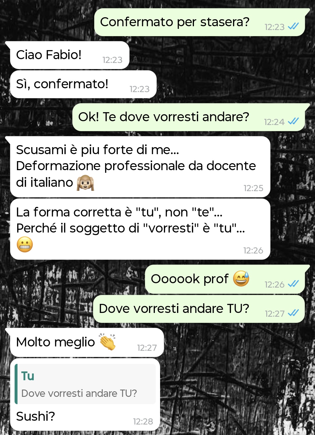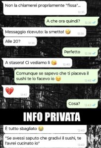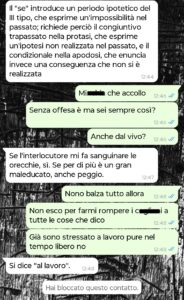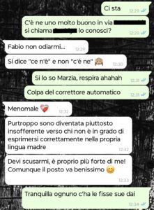 Non sono una persona che sta molto al telefono e mando messaggi solo se proprio devo e in questo caso dovevo. Un amico mio mi aveva fissato una cena con questa Marzia, la nuova prof di italiano della scuola dove lavora lui e che secondo lui era la donna giusta per me. Lei carina dalle foto, quindi perché no. Non ci avevo mai parlato, quindi le scrivo per chiederle conferma e niente, appuntamento più breve della storia. Inizia a correggere tutto quello che dico.