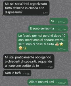 Beh… lui ha reagito in un modo che non avrei mai immaginato. Se c’è una cosa che ho imparato, è che l’amore non si costruisce solo con i gesti… ma anche con la volontà di farli. E se un uomo dopo dieci anni non ha il coraggio di impegnarsi seriamente, dico solo una cosa: non è un uomo, è un coniglio.