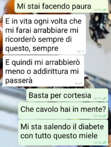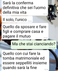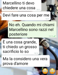 Buongiorno gente appassionata di chat altrui. Sono Marcello e di una sola cosa ho terrore: quando la mia fidanzata mi chiama Marcellino. La catastrofe è in arrivo. Di solito è una richiesta a cui non posso sottrarmi e che mi costa tantissimo, perché è una cosa che odio. Oppure una cosa che sembra una stupidata diventa un supplizio. Come l’ultima volta, un aiutino a suo padre e ai fratelli di un paio d’ore per spostare qualche mobile. E poi da solo io e il padre a fare un trasloco in più case…Dopo 6 anni conosco il mio pollo. (Si ok, il pollo sono io che le vado dietro). Ed ero quindi in allarme rosso al “Marcellino” e “prova d’amore”. Ma quello che mi ha chiesto… neanche Palpatine avrebbe il coraggio di spingersi a questi livelli. Leggete amici. E se qualcuno per amore farebbe quello che mi ha chiesto Letizia lo dica nei commenti è un bugiardo.”