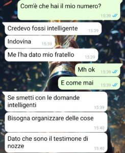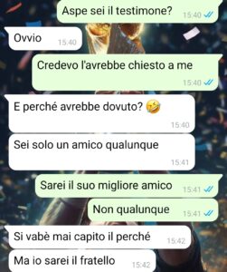 Siamo spiriti affini e gli voglio sinceramente bene, oltre a essere felice come una Pasqua per il fatto che si sposi. Peccato che questi grandi sentimenti io non riesca a provarli per suo fratello, una persona cattiva e pesante che riesce a far venire il brutto in ogni persona. Ed ecco che parte la litigata dopo che mi ha contattato, pretendendo cose che non doveva pretendere.”