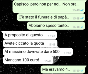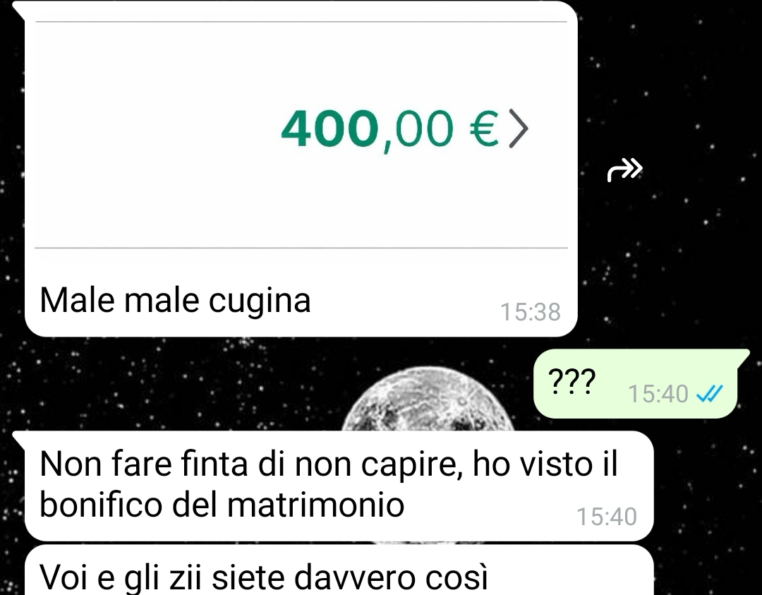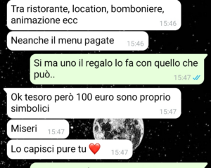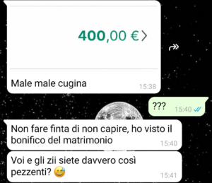 “Allora, io lo dico subito: questa chat ancora oggi mi fa venire il nervoso solo a guardarla. E non perché si parli di soldi in sé, perché i soldi vanno e vengono, e ognuno dà quello che può a un matrimonio, quello che si sente, quello che riesce. Il punto è proprio un altro. È il modo, il tempismo, la totale mancanza di tatto. E mia cugina in questo è la regina!!