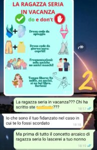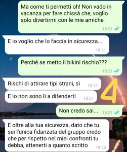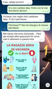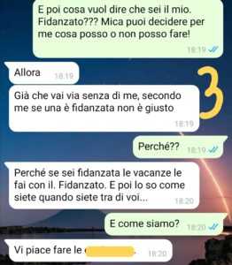 Premetto che loro sono tutte single e io sono l’unica fidanzata. Però ci tenevo tanto a fare questa vacanza con loro. Così ne parlo con il mio fidanzato e lui dice che non trova giusto che io vada con le mie amiche single quando io un fidanzato ce l’ho e in vacanza dovrei andare con lui. Ne segue una bella discussione: io non ho nessuna intenzione di rinunciare. Lui ci resta male, tiene il broncio per un po’… poi un giorno mi scrive poco prima della partenza. È rassegnato alla partenza, ma mi manda una cosa che mi chiede di seguire…ovviamente io ho una reazione a tutto questo ma adesso anche una marea di dubbi. Non sono mai stata fidanzata e non so come ci si debba Comportare. Io so solo una cosa: lo amo e non voglio perderlo, ma voglio anche divertirmi con le mie amiche.