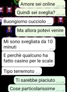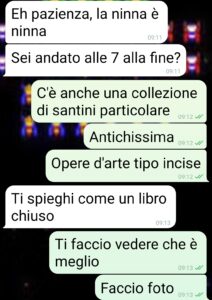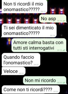 Io sono Laura e ok la domanda è forse estrema però ci ho pensato davvero, dico se ti viene in mente il dubbio allora c’è. Perché quello che Giuseppe mi ha dimostrato in questo sabato mattina di questa chat è che di me non ricorda (o non sa) e che comunque non gli frega (che è peggio) delle cose che riguardano me. Può un fidanzato non sapere quando è il tuo onomastico? Già è grave. Ma riesce pure a fare anche peggio. Io ci ho messo per adesso una pietra sopra, ma monitorerò la cosa. E voglio sentire le opinioni dei lettori. Anche se lui, ovviamente, mi voleva dissuadere dal mandarvi questi screen. Che tra l’altro ho preso dal suo telefono, che nel mio non so perché c’ho il timer per cancellare le chat. Giudicato (e condannato)con le prove che lui stesso fornisce! Ben gli sta. E adesso attendo con trepidazione il mese prossimo…il giorno del nostro primo anniversario…”