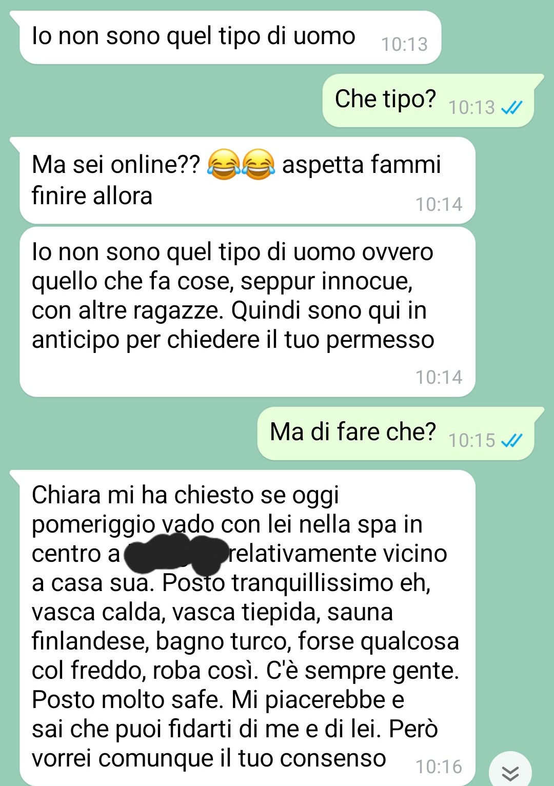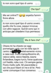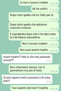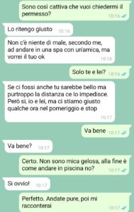“Io sono la prima che sostiene che nelle coppie il dialogo sia tutto, la fiducia nel partner, ancora di più, sia tutto, perché è troppo facile essere inutilmente gelosi (e mi riferisco a maschio o femmina indistintamente) e poi far saltare tutto appena c’è un minimo problema. Quello non è amore. L’amore è condivisione e sostegno verso e, soprattutto, è affrontare un problema se c’è e andare avanti. Credevo in tutto questo, ma dopo quello che è accaduto, le mie certezze vacillano un po’. Perché è vero che bisogna fidarsi e affidarsi al partner, ma dall’altra parte si deve dare dimostrazione di questa fiducia e soprattutto non ci devono essere mancanze di rispetto. Quello che mi è successo, a mio parere, è una gravissima mancanza di rispetto nei confronti della mia persona e della coppia. L’altro giorno, Matteo, il mio ragazzo, mi fa una richiesta. Una richiesta onesta, e apprezzabile anche solo per l’avermela fatta. Eravamo una coppia sana e lui mi chiede se poteva andare in una spa con un’amica che glielo aveva chiesto. Cosa dovevo rispondere? Ho risposto nel modo che ritenevo più giusto, il problema è ciò che è accaduto dopo.”