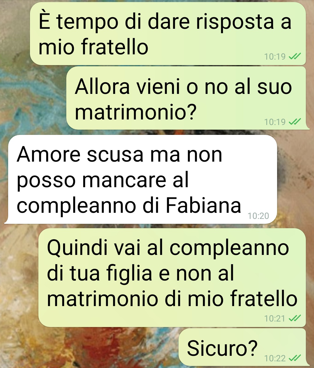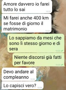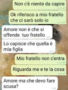 Salve spunte blu, in questa chat altro non faccio che ribadire ciò che una settimana addietro avevo già in qualche modo avevo detto a parole al mio compagno. Il fatto è che il matrimonio di mio fratello e il compleanno di sua figlia sono nella stessa serata. E lui ha pensato una settimana prima di decidere, o meglio per ribadire quanto aveva già deciso al momento del problema. Io ho 43 anni e non ho figli. Lui questa splendida ragazza che ha cresciuta da solo, che la madre li ha abbandonati praticamente dopo il parto. Stiamo insieme da 3 anni e non mi sono mai sognata di essere più importante di Fabiana. Accetto di essere il numero 2, credo sia naturale per chiunque amare di più i figli. Però anche da seconda merito di più, specie in certe situazioni. Sono la seconda persona che ami più al mondo dopotutto, non un ripiego.”