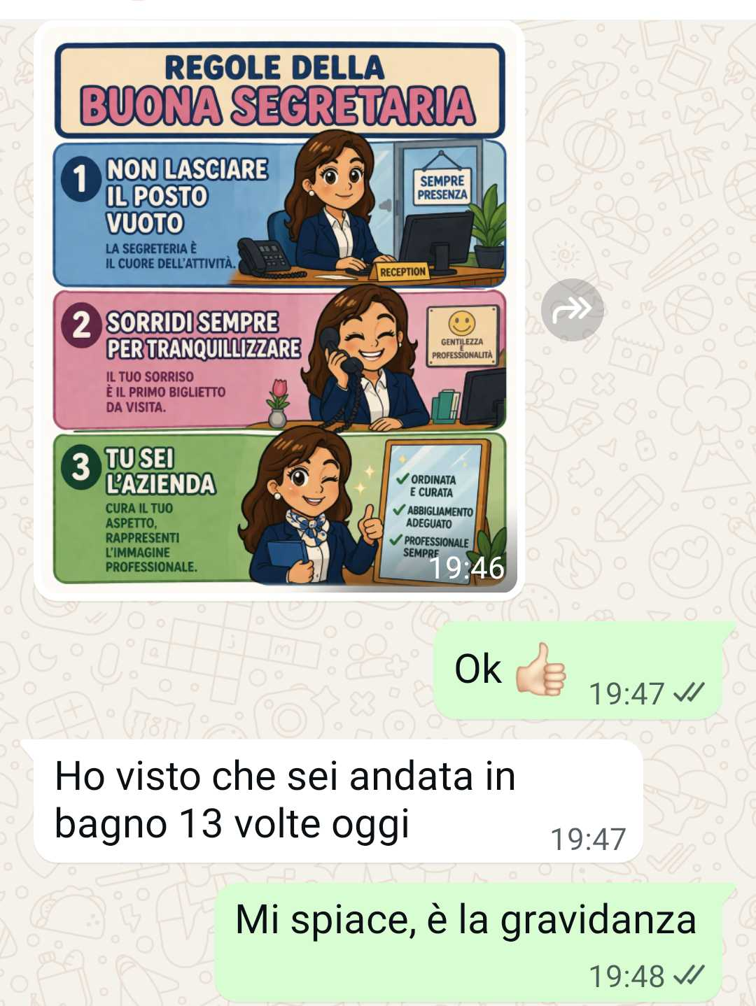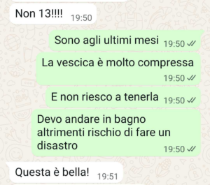 Lui dice che una buona segretaria non deve lasciare il desk, ma come faccio a non lasciarlo. Cosa è meglio che me la faccio sotto?? Non sarebbe un danno di immagine peggiore?? Io non so come farlo ragionare… intanto vi scrivo e vi mando la chat, magari mi suggerite cosa dirgli per fargli capire che no, non è una scelta il dovere andare in bagno quando sei agli ultimi mesi di gravidanza.”