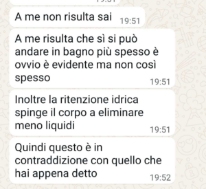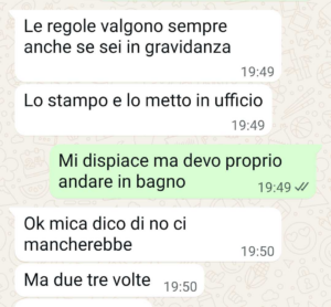 Ma non capisce che non è una scelta ma una esigenza. Vi mando la chat perché ho letto altre storie simili alla mia sulla vostra pagina e vorrei contribuire anche io a sensibilizzare le persone su questo tema, il tema della gravidanza. Io ho l’esigenza di andare spesso in bagno e anche di alzarmi perché ho le gambe gonfissime che cominciano a farmi male, ma sto bene, non ho nessuna malattia o nessun problema di salute. È solo la gravidanza. Come posso fare capire al mio capo che si dichiara pure grande esperto di gravidanze che è una cosa normale??