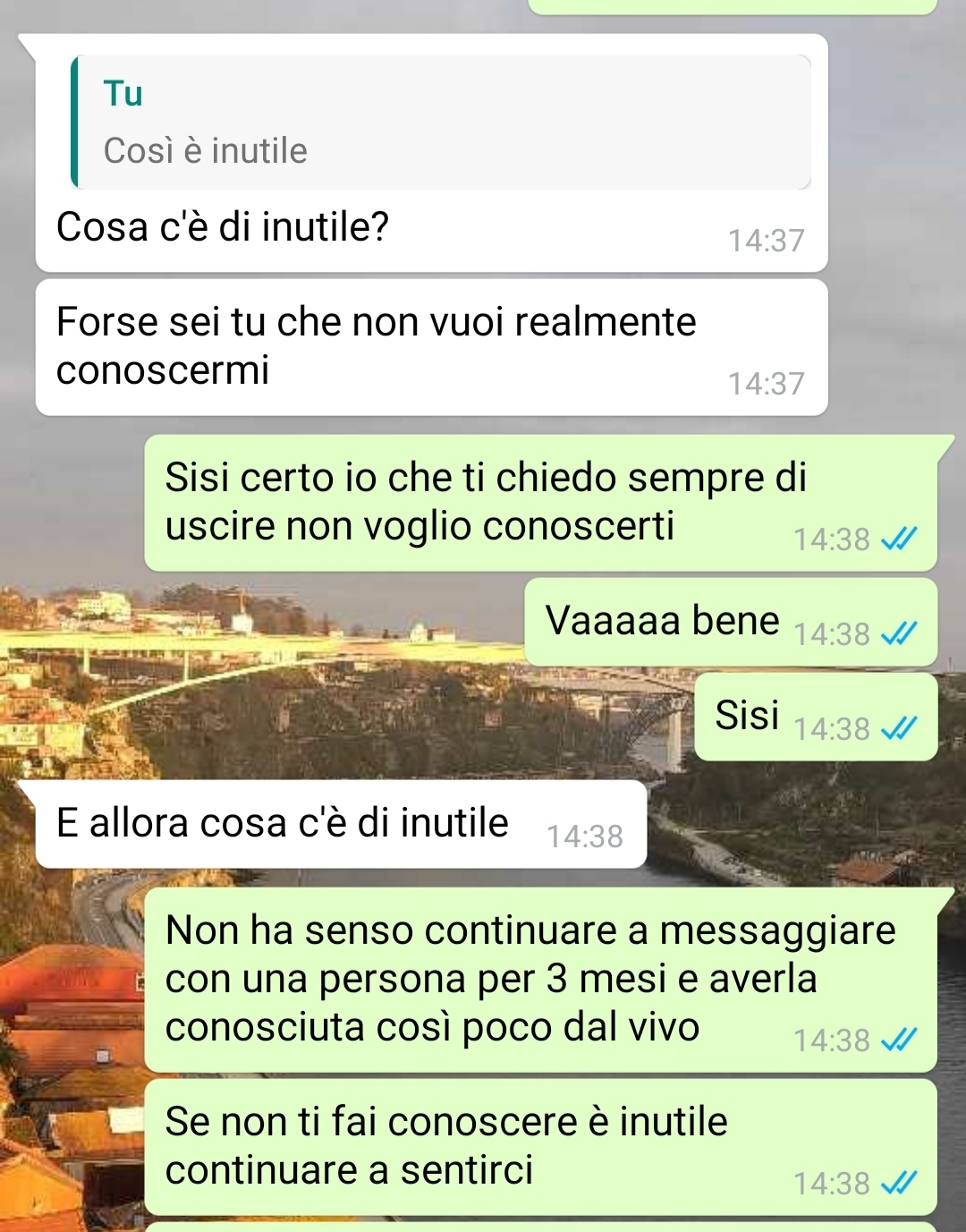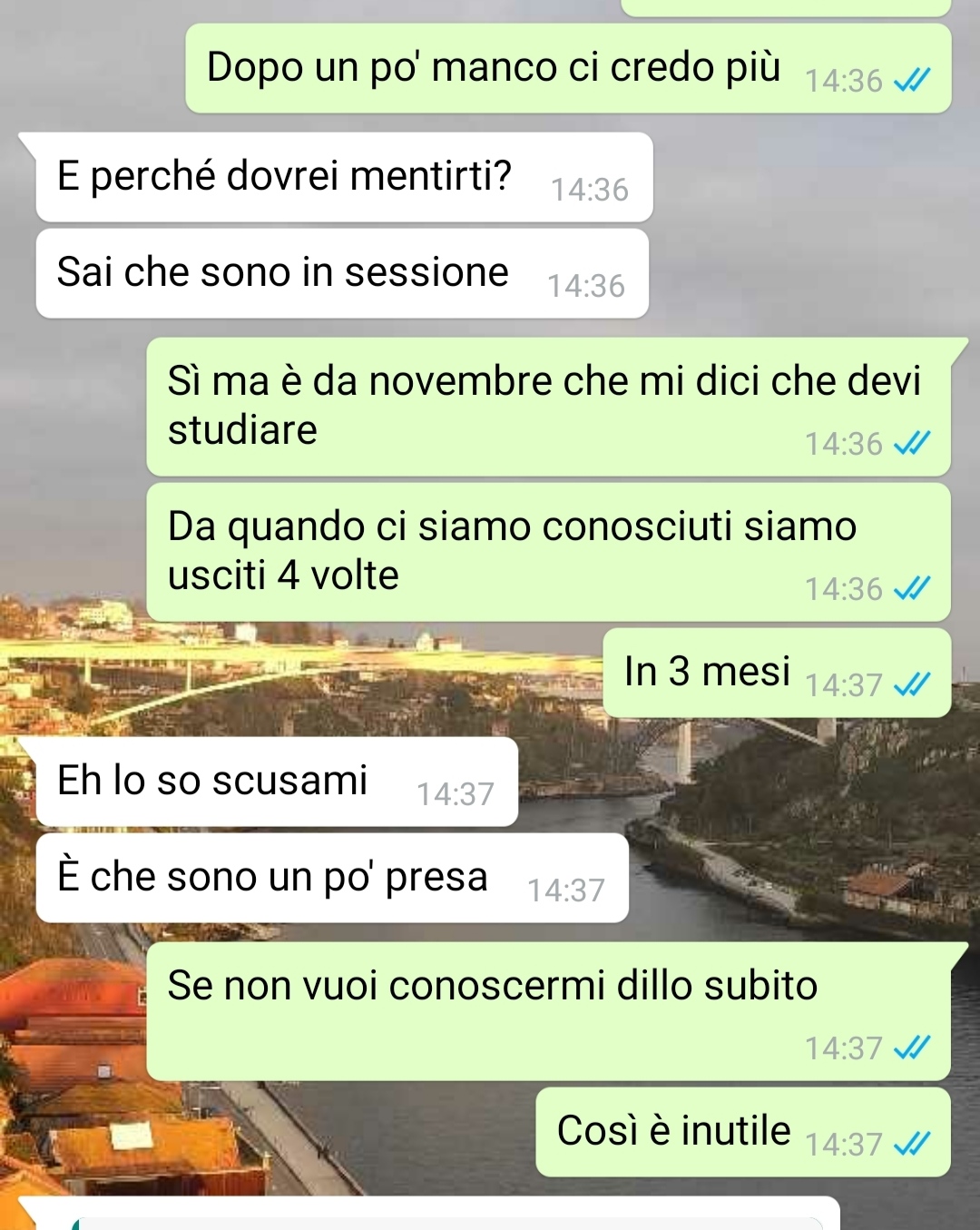 Oggi le ho chiesto per l’ennesima volta di vederci (anche solo per il tempo di un caffè!!), ma lei ha nuovamente rifiutato e da lì è iniziata una conversazione inaspettata che mi ha anche un po’ deluso.