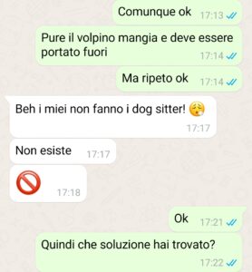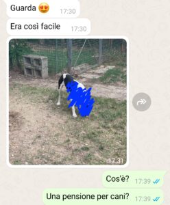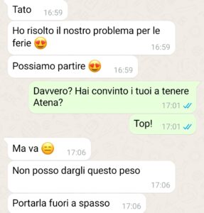 “Mi chiamo Giuliano e voglio condividere con il pubblico di Spunteblu la cosa più assurda che mi è capitata l’anno scorso. Si avvicinavano le ferie estive e la mia ragazza Benedetta voleva andare in Spagna. Mi parla di aerei, hotel, attività, posti da visitare, shopping da fare e cose di questo genere, ma a me scatta subito un campanello di allarme. Ho una responsabilità e non posso fare finta di niente: il mio cane Atena. Atena è la mia ombra, l’ho presa in canile quando aveva solo qualche mese, una cagnolina docile e piena di vita, ma anche piena di paure avendone passate tante. Mi dispiace se qualcuno leggendo la chat penserà che sono stato esagerato nelle parole, ma io ci tengo molto a lei e la tutelo. Quindi, portarla in aereo, in stiva era fuori discussione. Le avrei fatto soltanto più male e avrebbe avuto una paura in più. Quindi ho proposto alla mia ragazza di fare altro, in camper, così da far stare tranquilla Atena e goderci le ferie, ma Benedetta se ne è uscita fuori con una “soluzione”. Inutile dire come è andata a finire, immaginate voi stessi…”