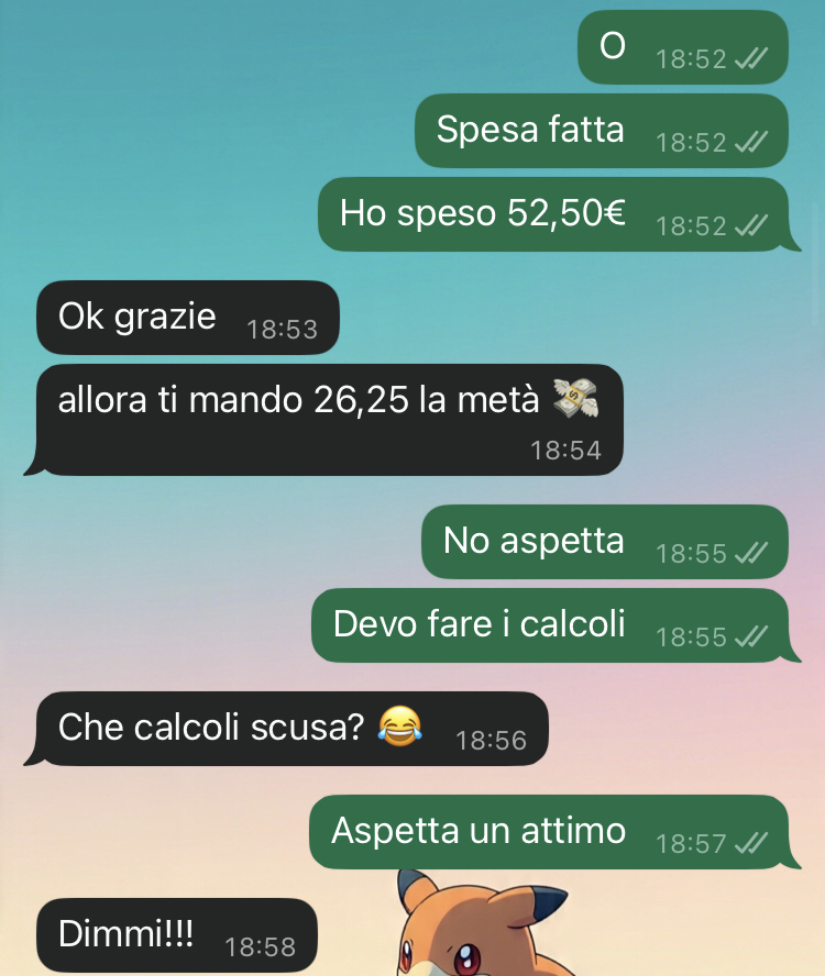 Io giuro che provo a starle dietro, ma è un casino, anche se faccio sempre del mio meglio. Però sono stufo di pagare di più per colpa sua e infatti quando arriva il momento di dividere le spese… lì scoppia il finimondo. Fino ad ora sono stato zitto, ma con l’ultima spesa le ho parlato chiaro e detto che dovevamo dividere in modo equo.