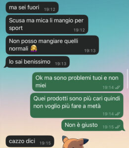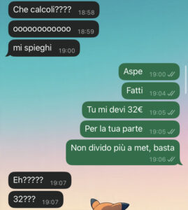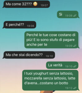 Vi lascio qui sotto la chat, giudicate voi. Se avete qualche consiglio o rimedio contro le fidanzate scroccone sono felice di leggervi, grazie!”
