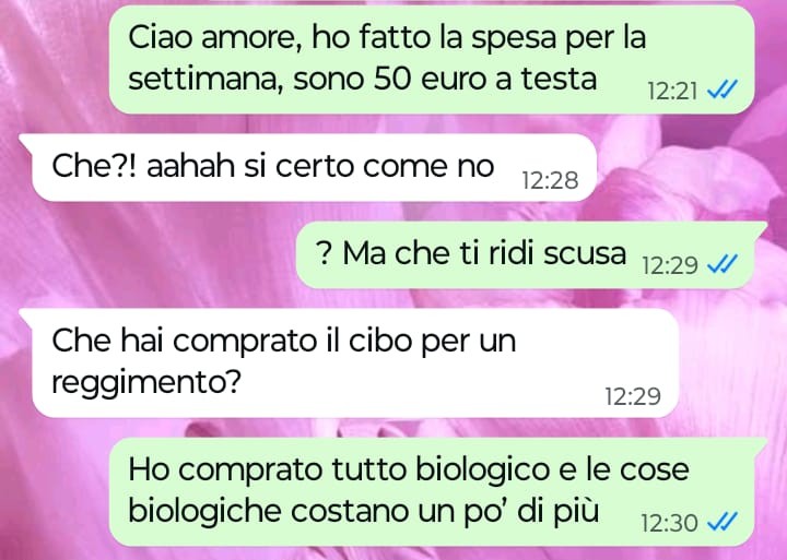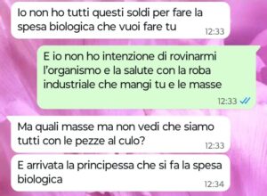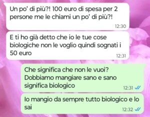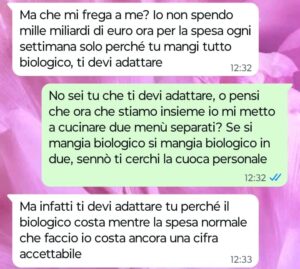 “Ciao Spunte Blu, mi chiamo Livia e sono andata a convivere con il mio ragazzo. Io sono sempre stata una persona che ama mangiare bene e fare attività fisica. Insomma per me il benessere fisico e mentale sono sempre venuti al primo posto e per quanto mi riguarda sarà sempre così finché vivrò. Il mio ragazzo però è di tutt’altro avviso, io questo di base l’ho sempre saputo da quando ci siamo messi insieme ma ora che siamo andati a convivere penso che dobbiamo trovare un punto di incontro in merito, sopratutto quando si tratta di alimentazione… il mio ragazzo però forse pensa che sono la sua schiava personale o peggio che mi sono sostituita a sua madre in questa nostra convivenza. Io ora non intendo sacrificare la mia salute e il mio benessere fisico e mentale per colpa sua quindi se lui non vuole adeguarsi a me e venirmi incontro facendo qualche compromesso e prendendosi carico di qualche “sacrificio” in più in cucina, per me la convivenza con lui finirà ancora prima di iniziare. Se c’è però qualcuno che pensa che sbaglio ditemelo chiaramente, io amo il confronto e per questo vi mando la mia chat anche se in questo momento penso di essere totalmente nel giusto.”