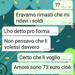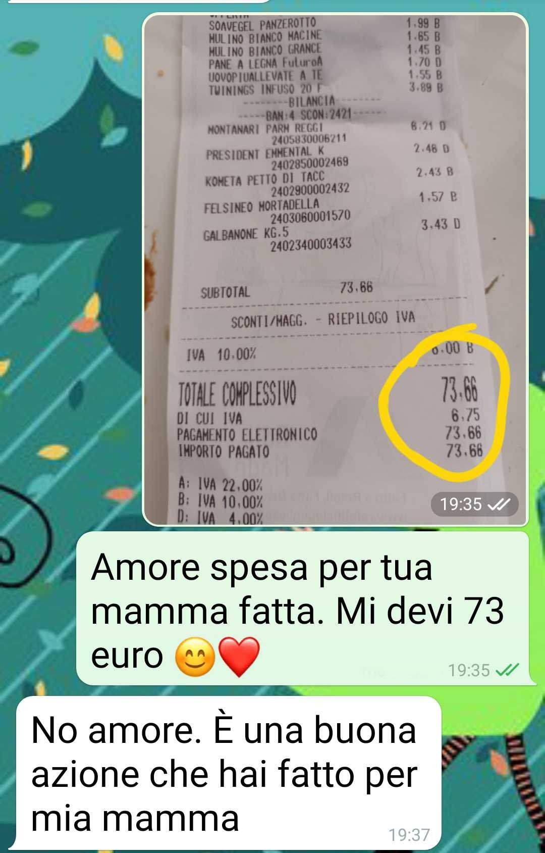 mia suocera si è rotta il braccio ed ha difficoltà ad andare a fare la spesa da sola. così l’ho fatta io. mi ha dato la sua lista della spesa con un sacco di cose da comprare e le ho fatto la spesa che penso che durerà almeno due settimane. ho speso ben 73 euro. il mio compagno mi ha detto che me li avrebbe ridati. ma ora non me li vuole più ridare.