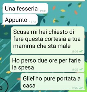 mi ha anche detto delle cose terribili su di lui e sua madre. e io non so più se fidarmi più di lui e di loro. non so più con chi sto. quello che mi ha detto mi ha fatto assolutamente schifo e mi ha fatto pensare che mi stesse pesantemente prendendo per i fondelli. io non sono una persona veniale, mi ritengo abbastanza gentile. ma non sopporto le prese in giro. Siccome mi sono confusa su questo argomento Ecco vi sto mandando la chat per sapere cosa ne pensa il popolo di spunte. qui di seguito vi mando gli screen. buona serata”
