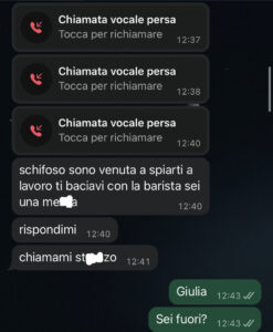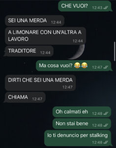 Praticamente è venuta a spiarmi a lavoro e sono convinto che questo sia stalking bello e buono, e poi mi ha scritto e chiamato facendo una scenata di gelosia assurda… Alla fine mi ha detto che non era come pensavo e che doveva dirmi una cosa importante.