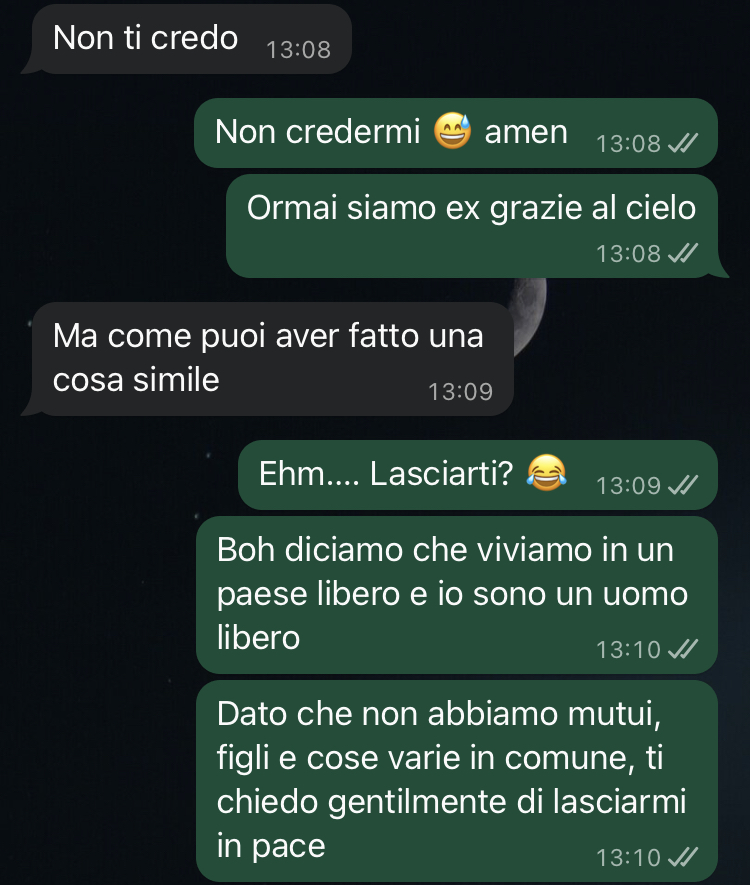 Ora, non è che voglio fare il solito che dà la colpa a “quella pazza della mia ex”, anche se, raga, aspettate di leggere, ma vi giuro che certe scene nemmeno nei film.