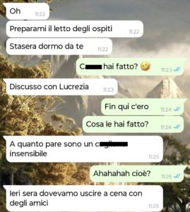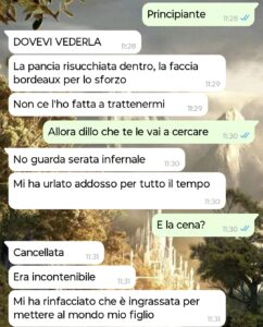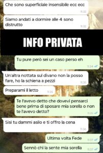 Mia sorella ha tante qualità ma come difetto ha quello di essere permalosissima, soprattutto sull’aspetto fisico. Sempre stata così. Federico lo sa, ma ha commesso un errore clamoroso: le ha fatto capire che ha messo su qualche chiletto. Da qui il delirio. Non dico altro per non rovinarvi la lettura, però consiglio spassionato a tutti i lettori uomini: se la vostra donna ve lo chiede, se si prova un vestito ecc, voi rispondete sempre che no, è in perfetta forma e che sì, sta benissimo e il vestito le calza a pennello. Controllate le espressioni facciali perché vedono tutto.