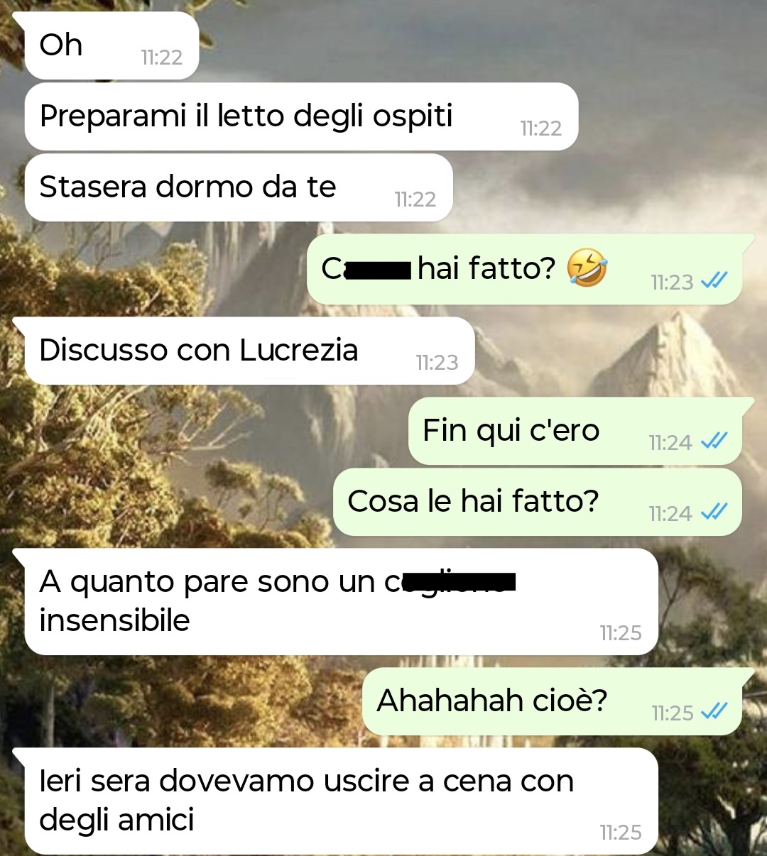 Sono una bella coppia eh, non fraintendetemi, cioè per mia sorella non potevo sperare in un uomo e marito migliore, però sono anche tanto diversi e a volte si scornano per stupidaggini. E quando succede lei lo fa dormire sul divano per giorni e alla fine lui si rifugia nella mia camera degli ospiti. Con ovvio dispiacere di Lucrezia.