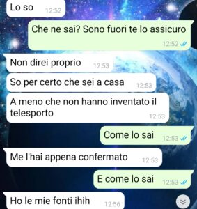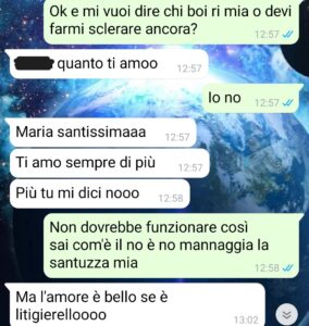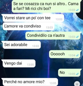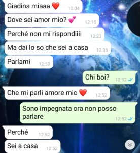 “Relazioni tossiche? Io ne ho avute e anche tante, ma mai così. C’è stato un ragazzo che mi controllava costantemente, uno che voleva che mi vestissi come voleva lui e uno che non accettava la mia indipendenza e non voleva che andassi a casa dei miei amici o ci restassi sola per un caffè. Come se andando a prendere un caffè al bar si possa fare qualcosa per tradire. Sono sempre stata la persona più fedele e corretta che esista al mondo, ma non sono mai riuscita a trovare persone che riuscissero ad andare oltre le loro paranoie e fidarsi. Almeno finché ho trovato Vincenzo, il ragazzo con cui ho la conversazione nella chat che vi mando. Lui sembrava diverso e uno che mi lasciava i miei spazi, ma poi ho capito perché lo faceva. Ora è diventato esattamente come tutti gli altri se non peggio e sinceramente mi mette anche un po’ paura. Io sono Giada comunque, e vorrei condividere con tutti voi questa chat per far capire ad altre ragazze come comportarsi nel caso in cui si trovassero in difficoltà come me.”