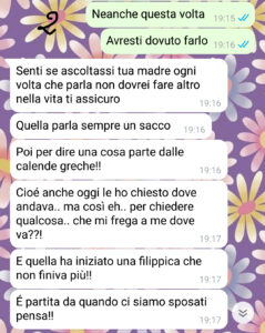 Purtroppo non posso negare l’evidenza e devo dare ragione a mia madre: lui non da importanza a cosa fa.. di fatto per lui esiste solo il suo lavoro e i suoi bisogni, tutto il resto non esiste! E soprattutto non l’ascolta mai.. non l’ha ascoltata neanche quando lei gli ha detto che lo lasciava.. leggete..”