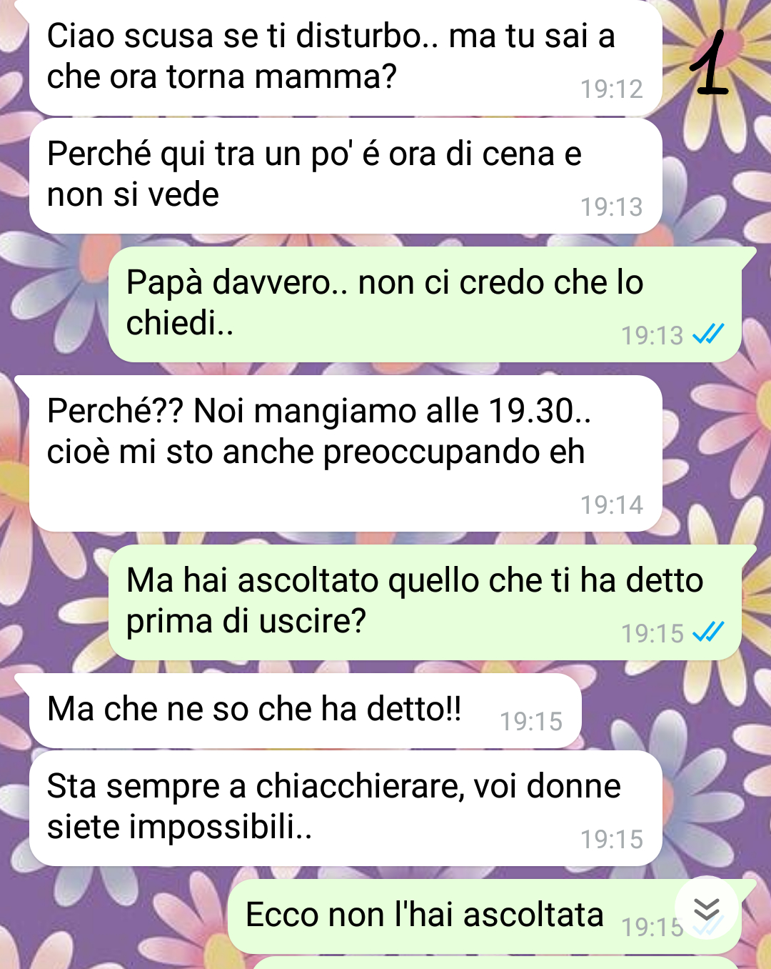 Purtroppo non posso negare l’evidenza e devo dare ragione a mia madre: lui non da importanza a cosa fa.. di fatto per lui esiste solo il suo lavoro e i suoi bisogni, tutto il resto non esiste! E soprattutto non l’ascolta mai.. non l’ha ascoltata neanche quando lei gli ha detto che lo lasciava.. leggete..”