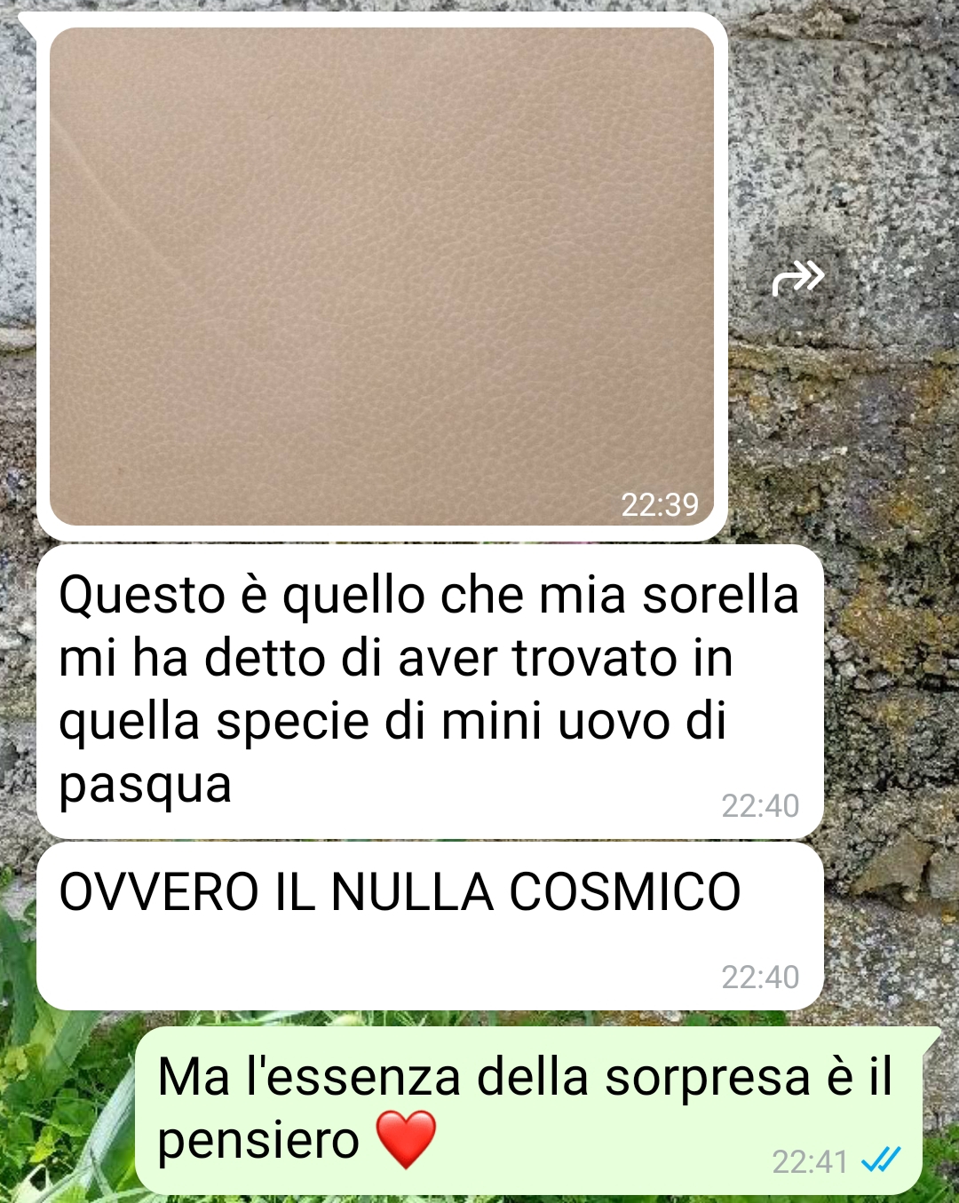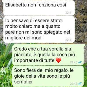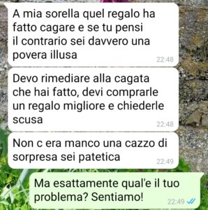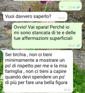 “… Il mio ragazzo si è lamentato perché non solo non gli è piaciuto l’uovo di Pasqua che ho comprato per sua sorella, ma anche perché l’uovo non conteneva nessuna sorpresa. E quindi sì, lui si è arrabbiato tanto con me e come sempre non mi ha trattata benissimo. Però nella vita non si può sempre sopportare, bisogna avere anche il coraggio di ribellarsi e affrontare le proprie paure. Bisogna scegliere se stessi quando nessuno ci vede, quando gli altri ci affossano, quando non ci lasciano respirare. Ora mi sento libera!”