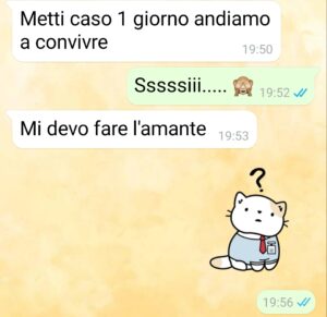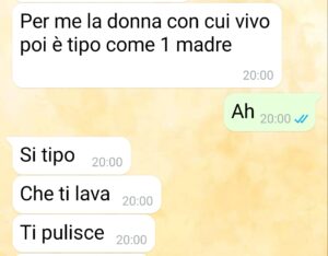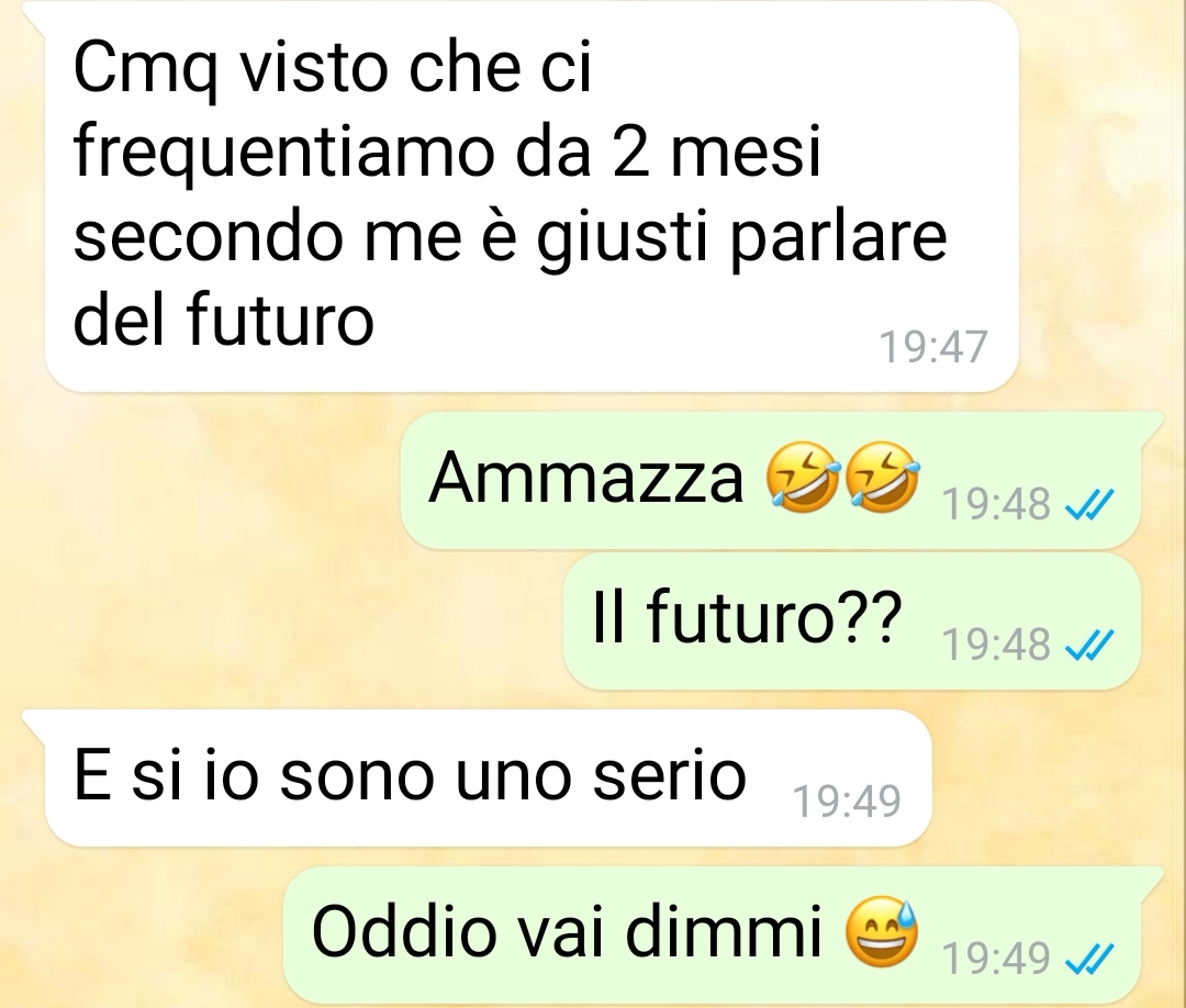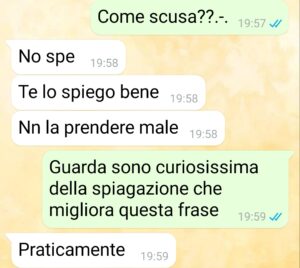 A un certo punto, dopo due mesi che ci frequentavamo, lui ha deciso di farmi domande sul futuro. Due mesi capite? Però ho detto boh ok è uno che ci pensa e di sti tempi è difficile, che viviamo tutti alla giornata. E io infatti pensavo che stessimo per fare un discorso normale. Invece nel giro di pochissimo questa conversazione ha preso una piega talmente assurda che ancora oggi faccio fatica a credere che sia successa davvero. Perché un conto è avere una visione discutibile della coppia, un conto è pretendere di accettare i tradimenti!! E io cosa dovevo essere?? La donna di casa mentre lui se la spassava in giro con un’altra! Secondo la sua visione della coppia ci sono due tipi di donne: la donna di casa e la donna di piacere! No ma assurdo. Più assurda però è stata la sua giustificazione a questa cosa e io mi sento di consigliarti una cosa Gaetano….. Fatti vedere da uno bravo!!”