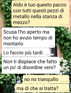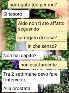“Salve pagina di spunte blu, io sono Floriana e voglio condividere con voi questa chat in cui Aldo ha preso un’iniziativa d’amore piuttosto borderline. Lui ha 60 anni e io 55. Ci siamo conosciuti 2 anni fa, entrambi divorziati e disillusi dall’amore. È stato un vero colpo di fulmine, chi l’avrebbe detto a questa età? Ma io sono rinata, e posso dire di non essere mai stata tanto amata da nessuno prima di lui. Sono senza dubbio i 2 anni più belli della mia vita fino ad ora. Siamo una vera quasi coppia, ma non viviamo assieme. Lui ha una figlia minorenne e giustamente non intacchiamo la di lei comfort zone. Ma ha le chiavi di casa mia e siamo come 2 fidanzatini. Mai una volta che mi abbia detto non posso a qualcosa. Adesso però ha un fastidio alla prostata che deve essere risolto. E a ben pensato di non tralasciare nulla… che imbarazzo… ma che tenero! L’amore esiste, anche a 60 anni. Credetemi”