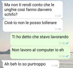“Ciao, il mio nome è Renato e sono un artigiano, sì, lavoro con le mani, lo so che nel nostro periodo è strano ma non ho studiato, odio i libri e amo lavorare manualmente. Mi diletto anche con piccoli lavoretti di meccanica, sono un tipo molto pratico. Così ho controllato la batteria della macchina della mia ragazza, che sì stava dando problemi. Ma non pensavo che un gesto così cortese potesse far uscire una sua nuova veste. Mi ha lasciato di stucco, triste e criticato per il mio modo di essere forza non all’altezza della società di oggi. Mi dispiace non essere come tutti..”