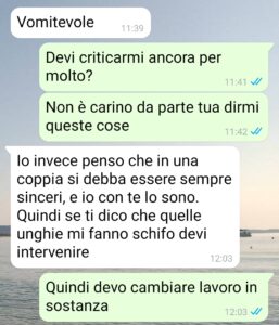“Ciao, il mio nome è Renato e sono un artigiano, sì, lavoro con le mani, lo so che nel nostro periodo è strano ma non ho studiato, odio i libri e amo lavorare manualmente. Mi diletto anche con piccoli lavoretti di meccanica, sono un tipo molto pratico. Così ho controllato la batteria della macchina della mia ragazza, che sì stava dando problemi. Ma non pensavo che un gesto così cortese potesse far uscire una sua nuova veste. Mi ha lasciato di stucco, triste e criticato per il mio modo di essere forza non all’altezza della società di oggi. Mi dispiace non essere come tutti..”